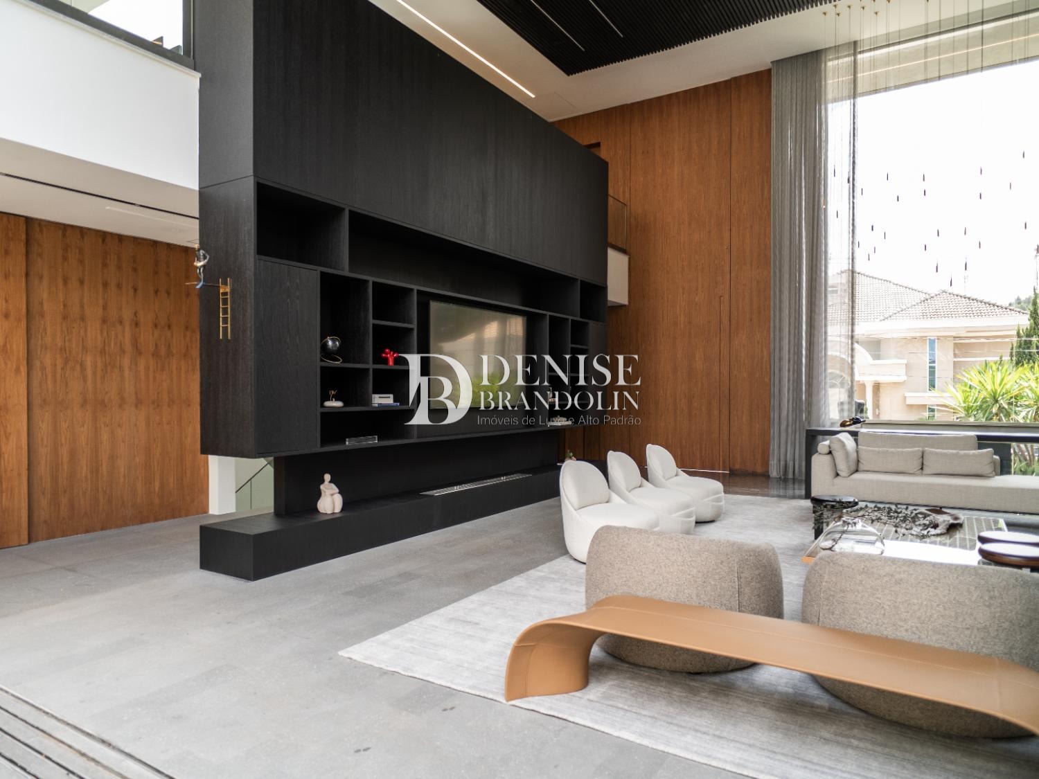 Charmoso living com pé direito altíssimo para vários ambientes, elevador todo revestido em madeira e um lindo gourmet todo integrado, muito aconchegante e agradável.