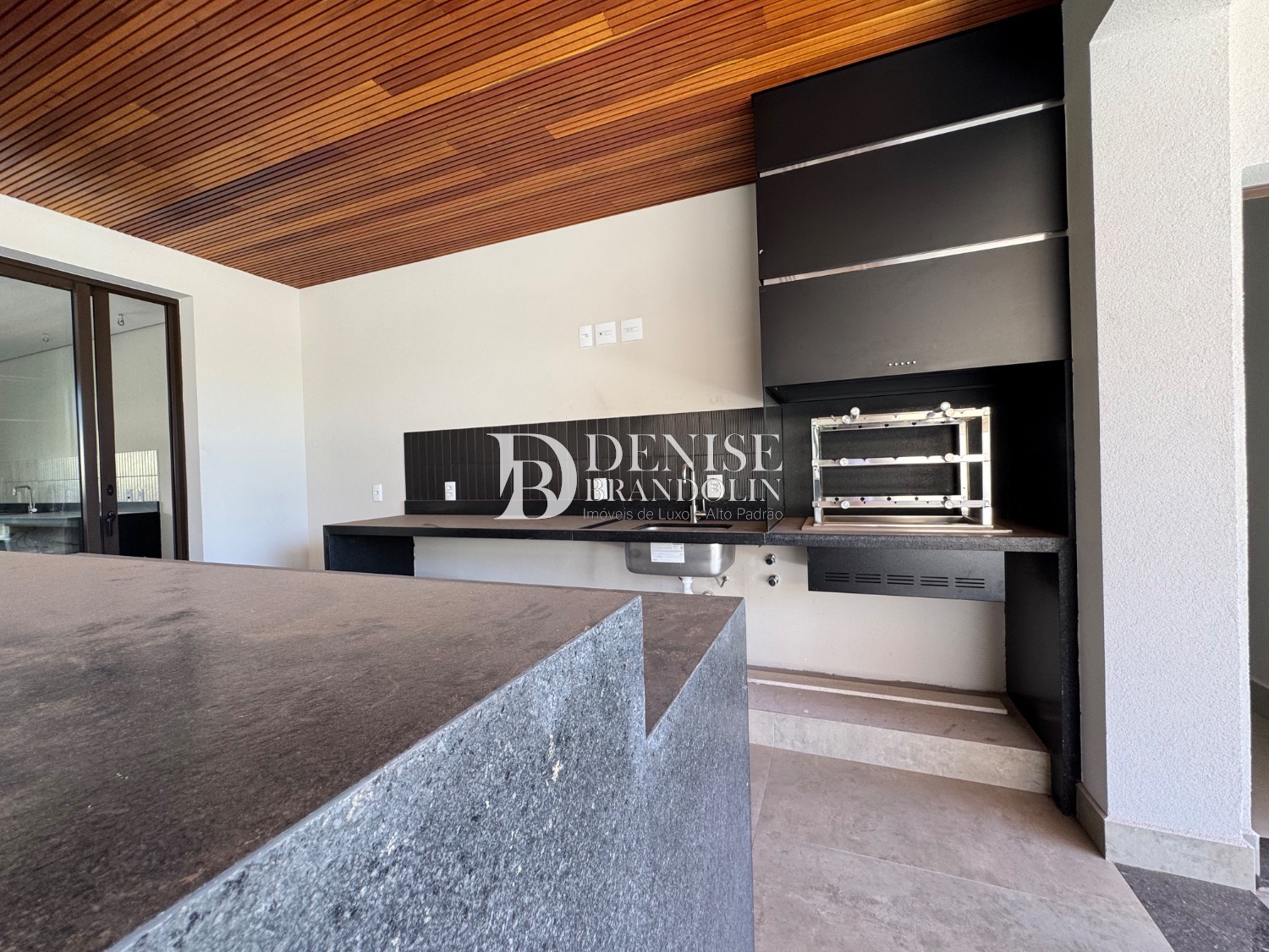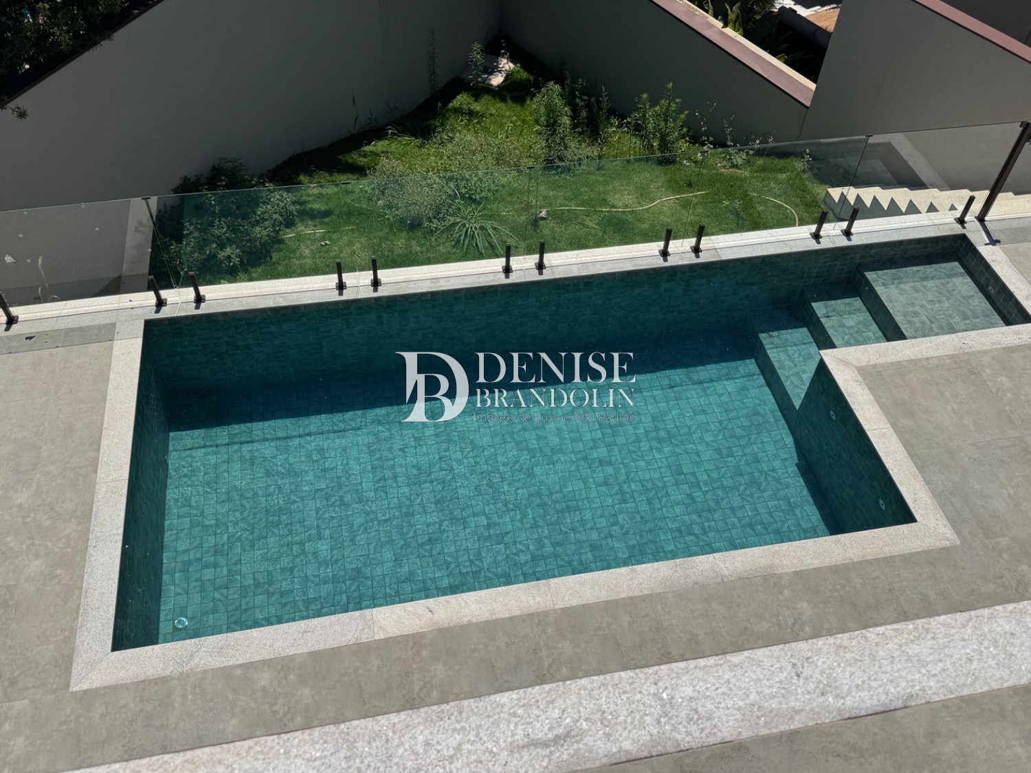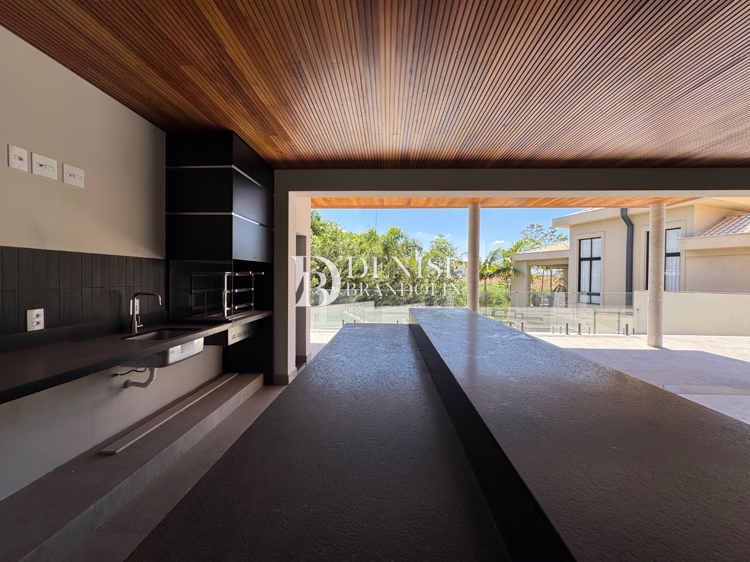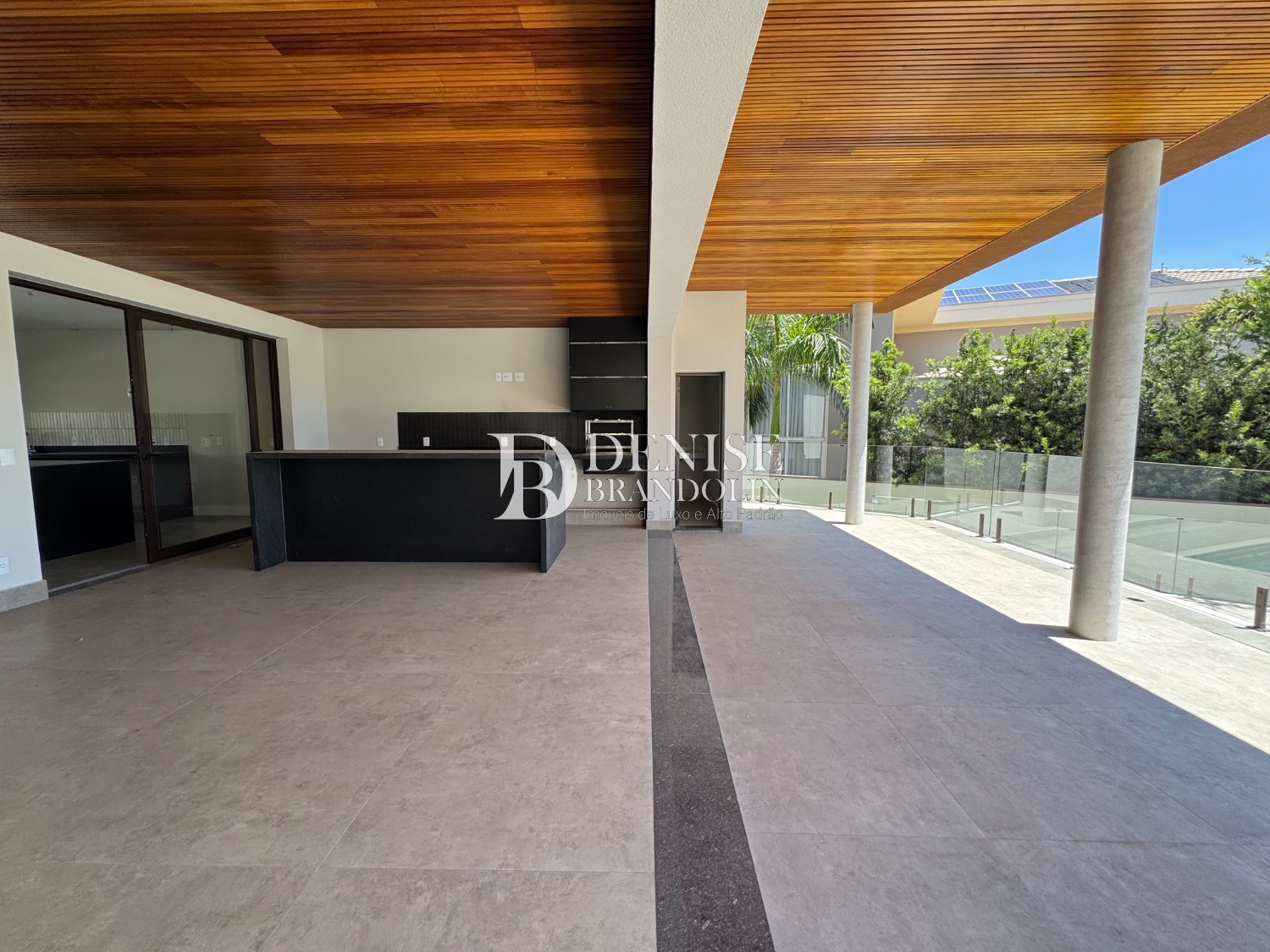 Espaço Gourmet com churrasqueira, piscina e quintal.