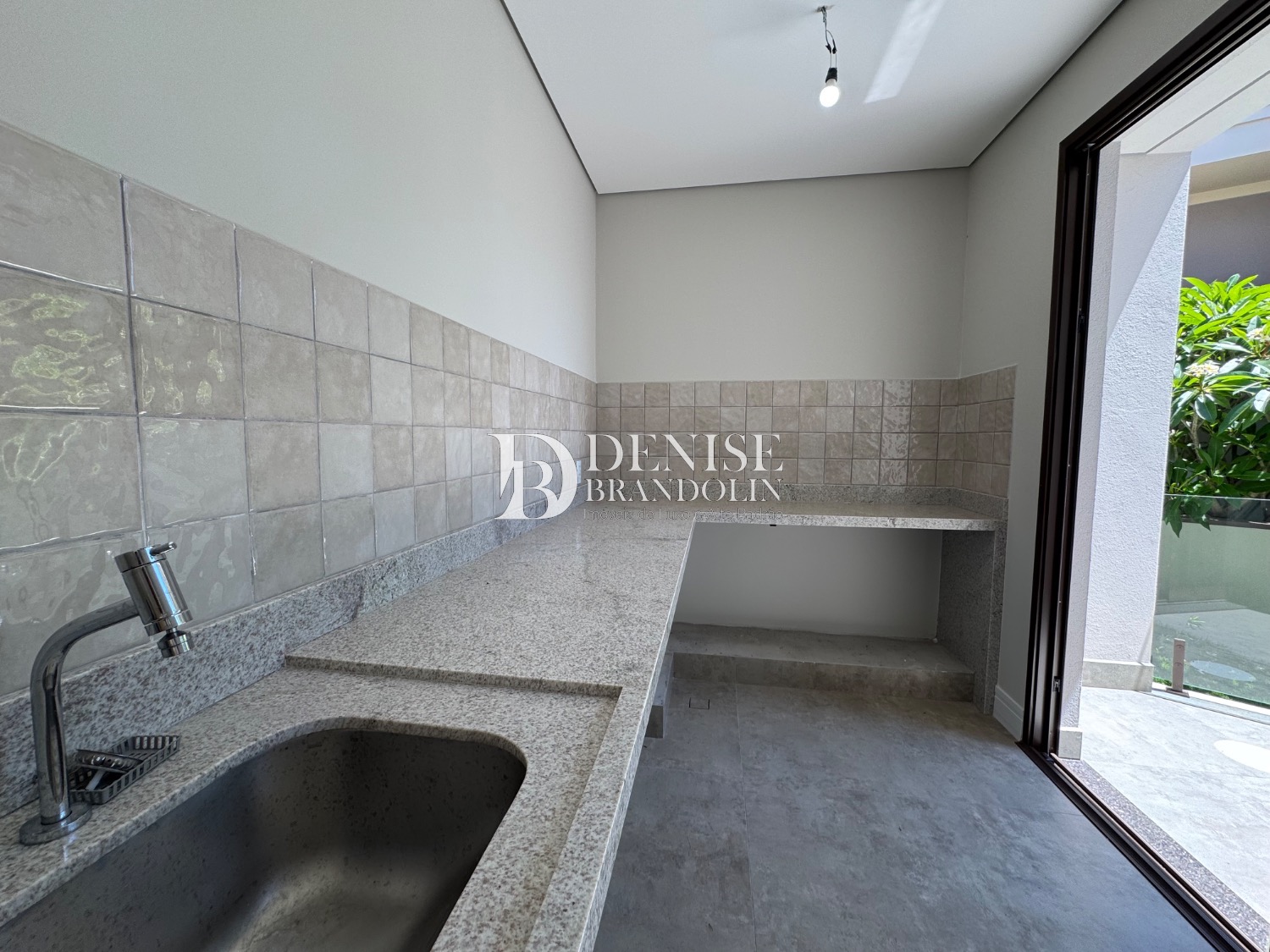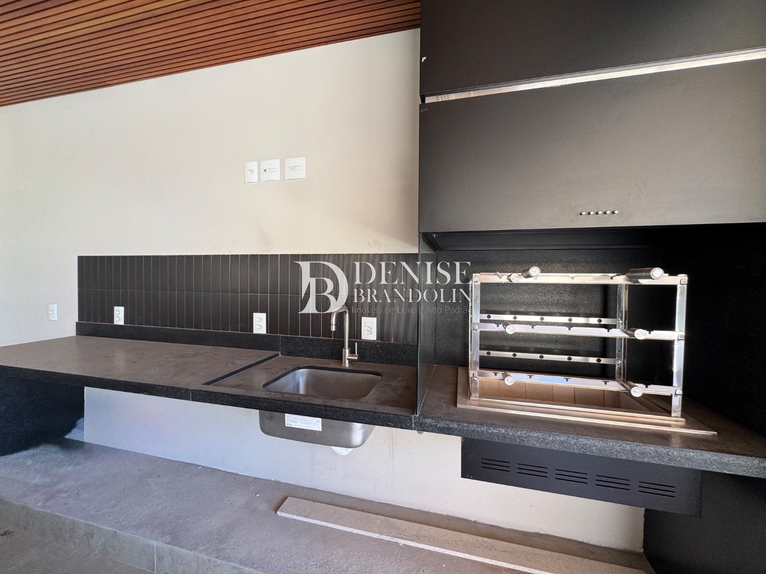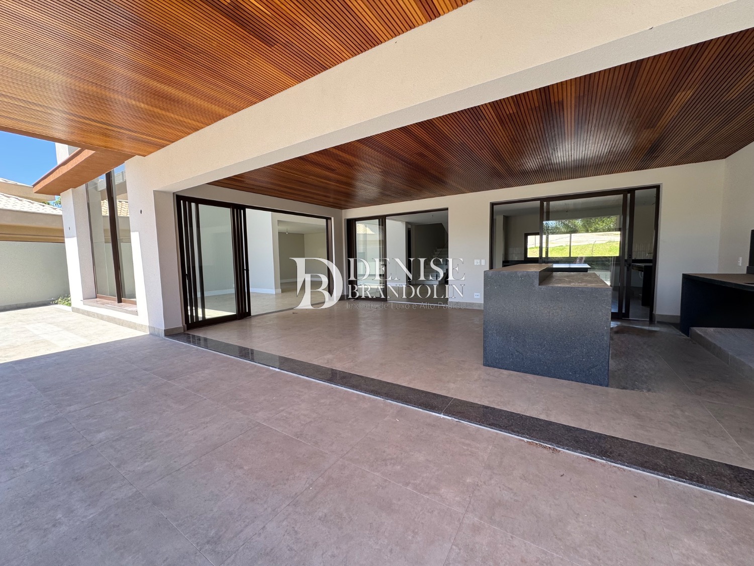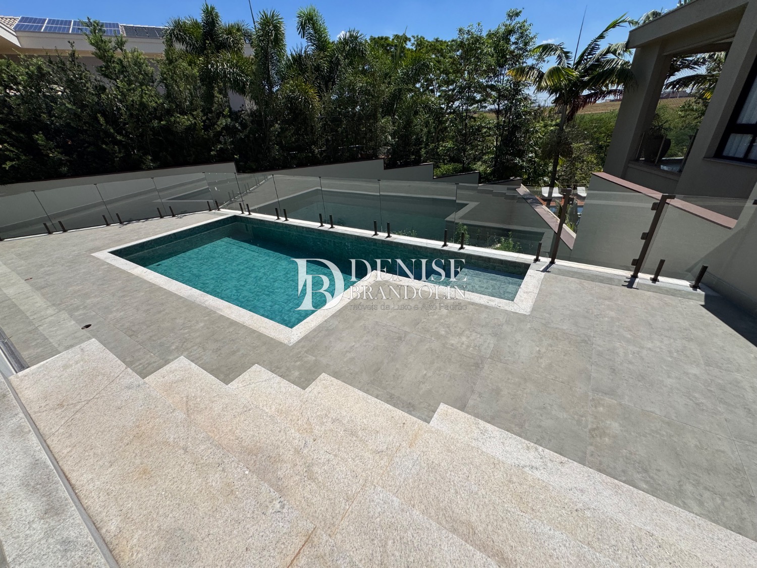 Espaço Gourmet com churrasqueira, piscina e quintal.