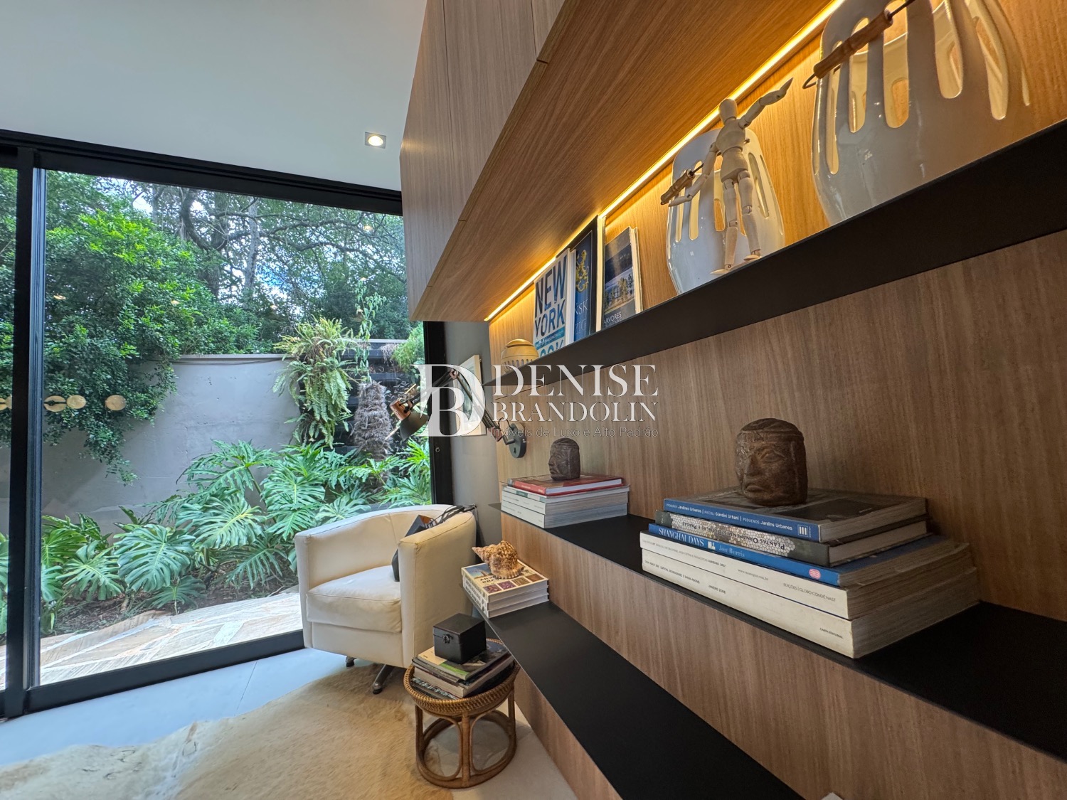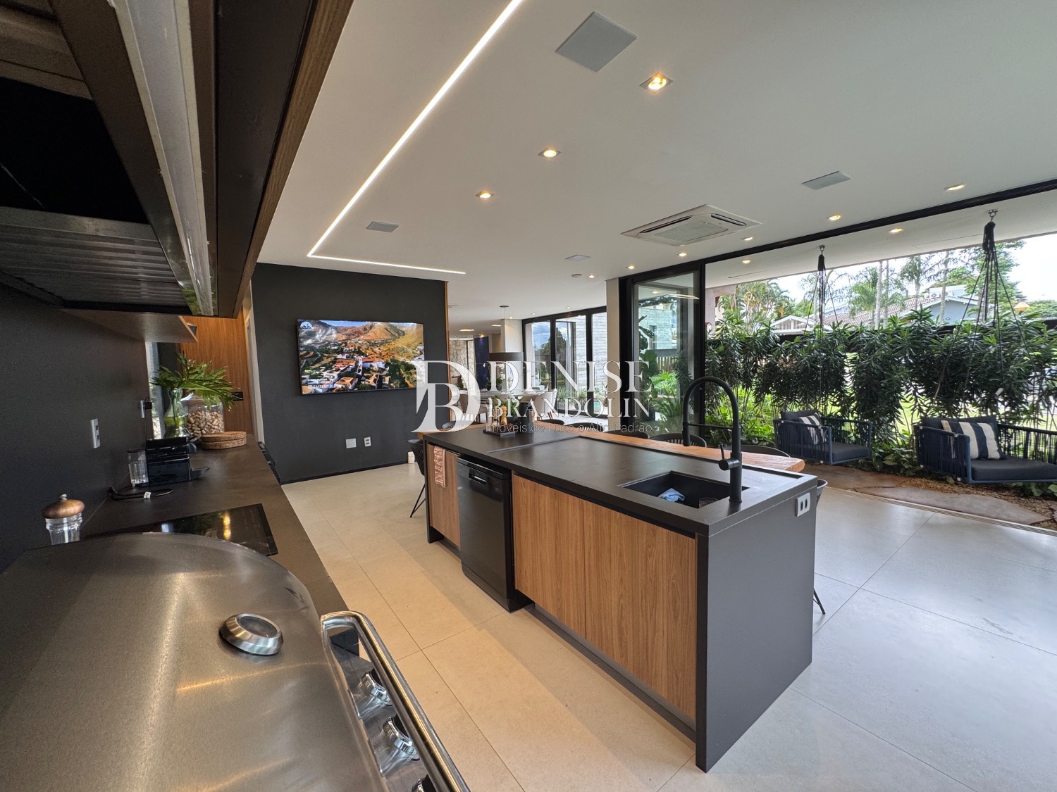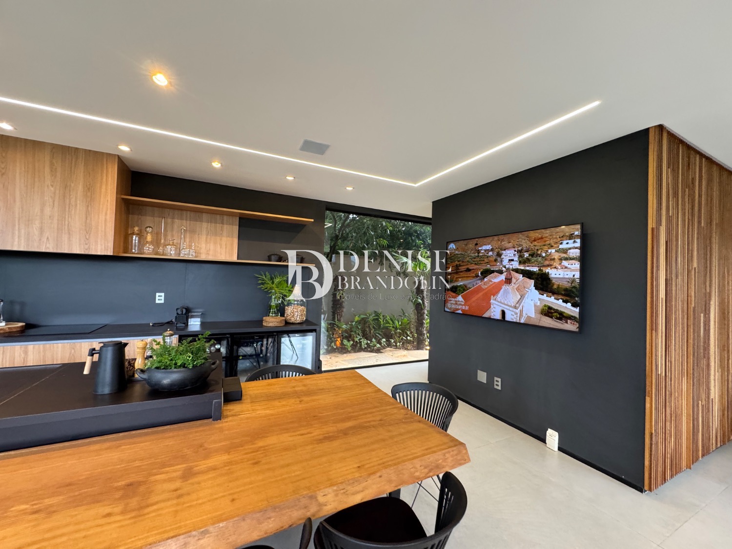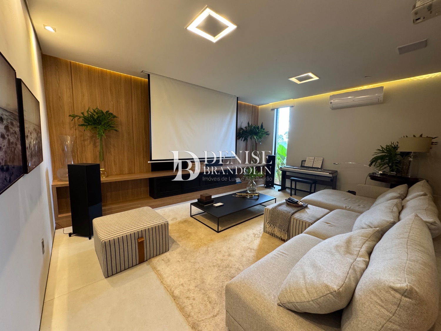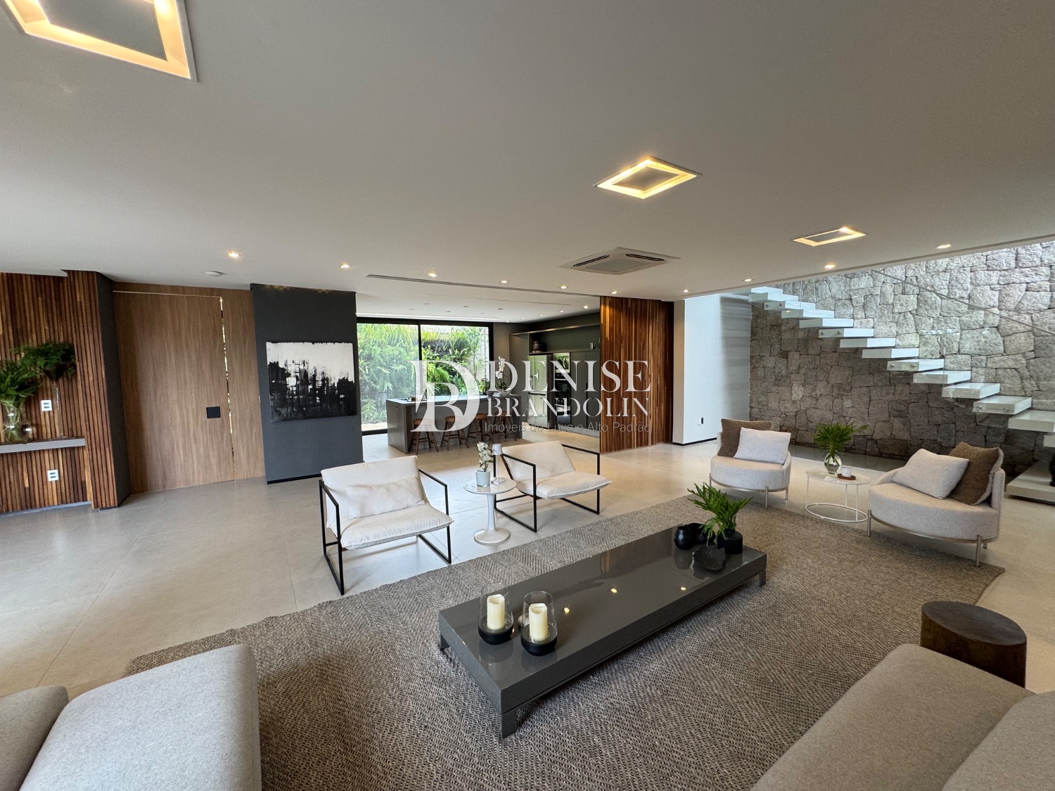 1º Pavimento: Living com pé direito para vários ambientes integrado com ambiente externo e paisagismo, lavabo, home cinema e cozinha gourmet.
