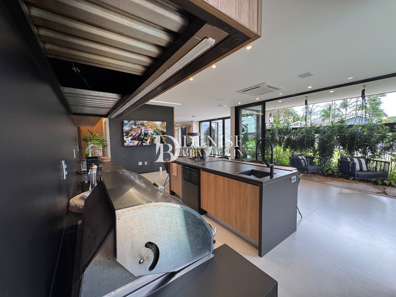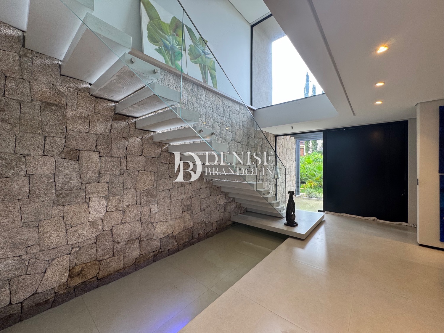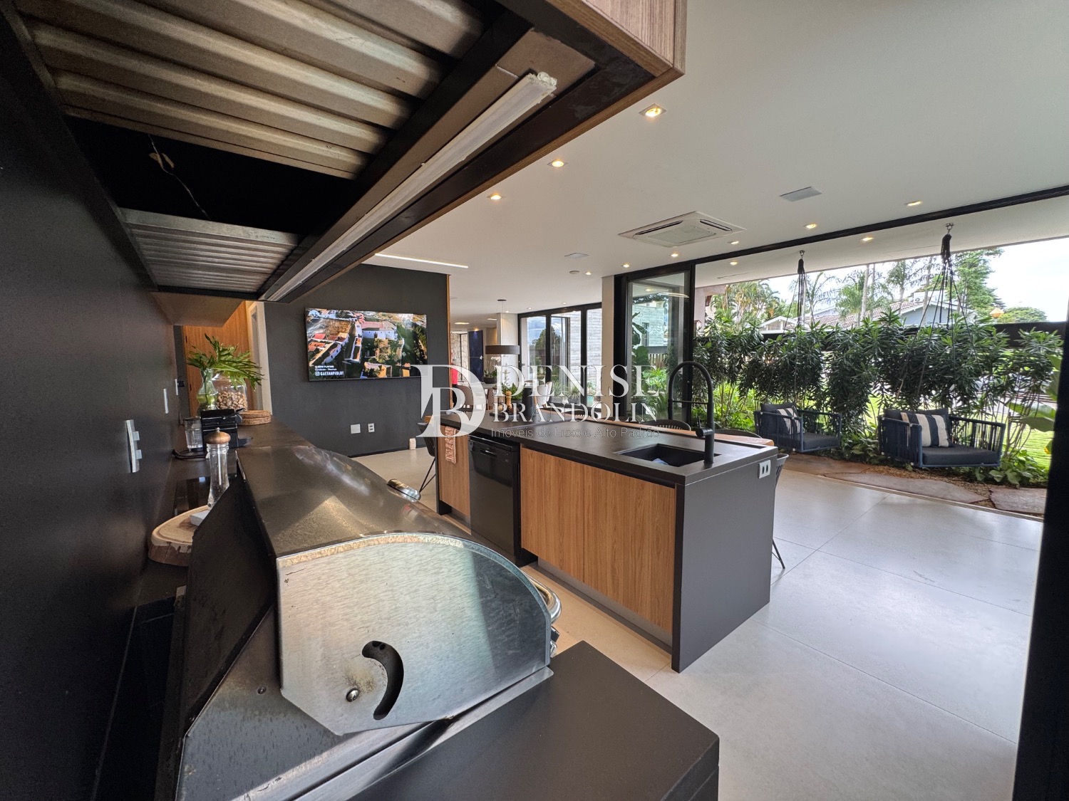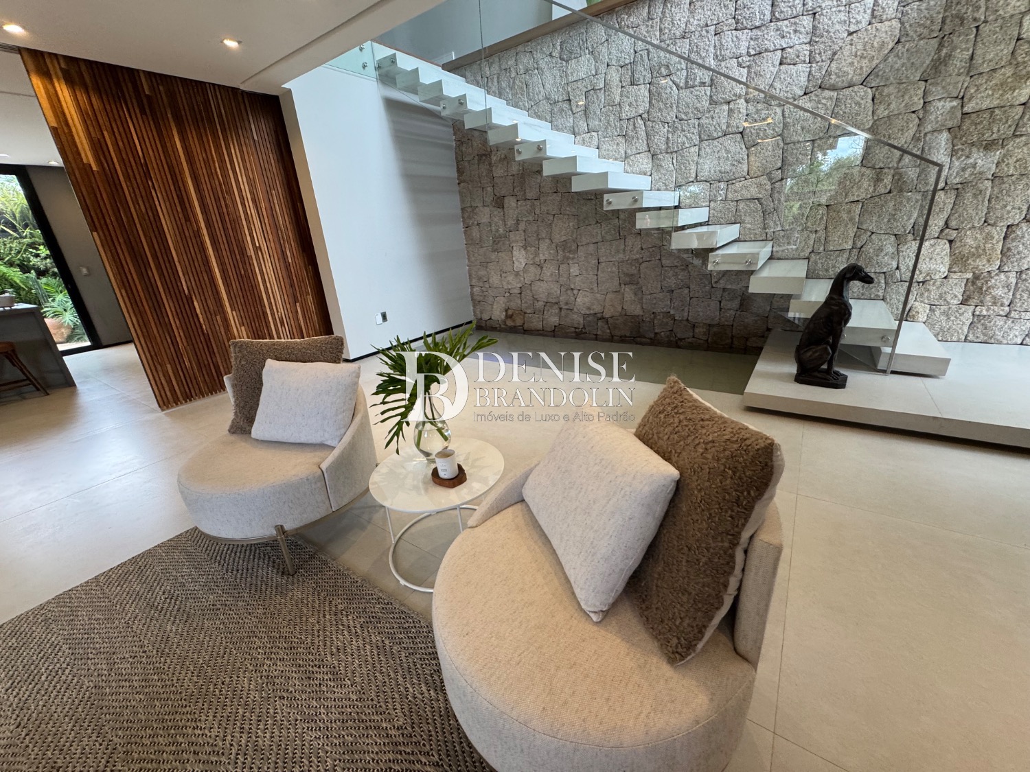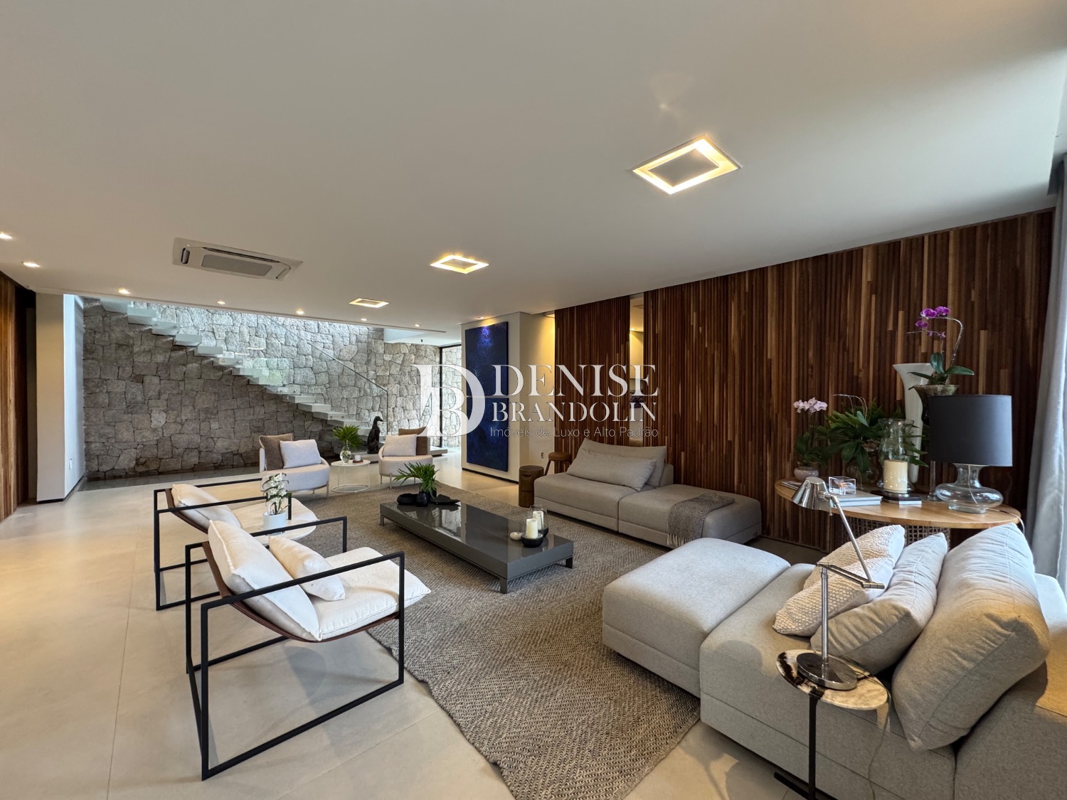 1º Pavimento: Living com pé direito para vários ambientes integrado com ambiente externo e paisagismo, lavabo, home cinema e cozinha gourmet.
