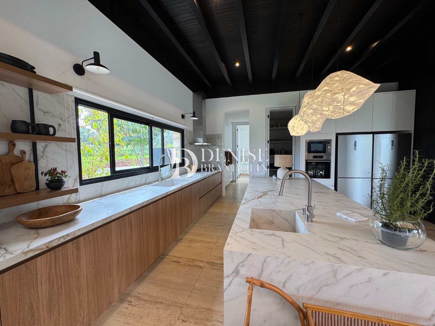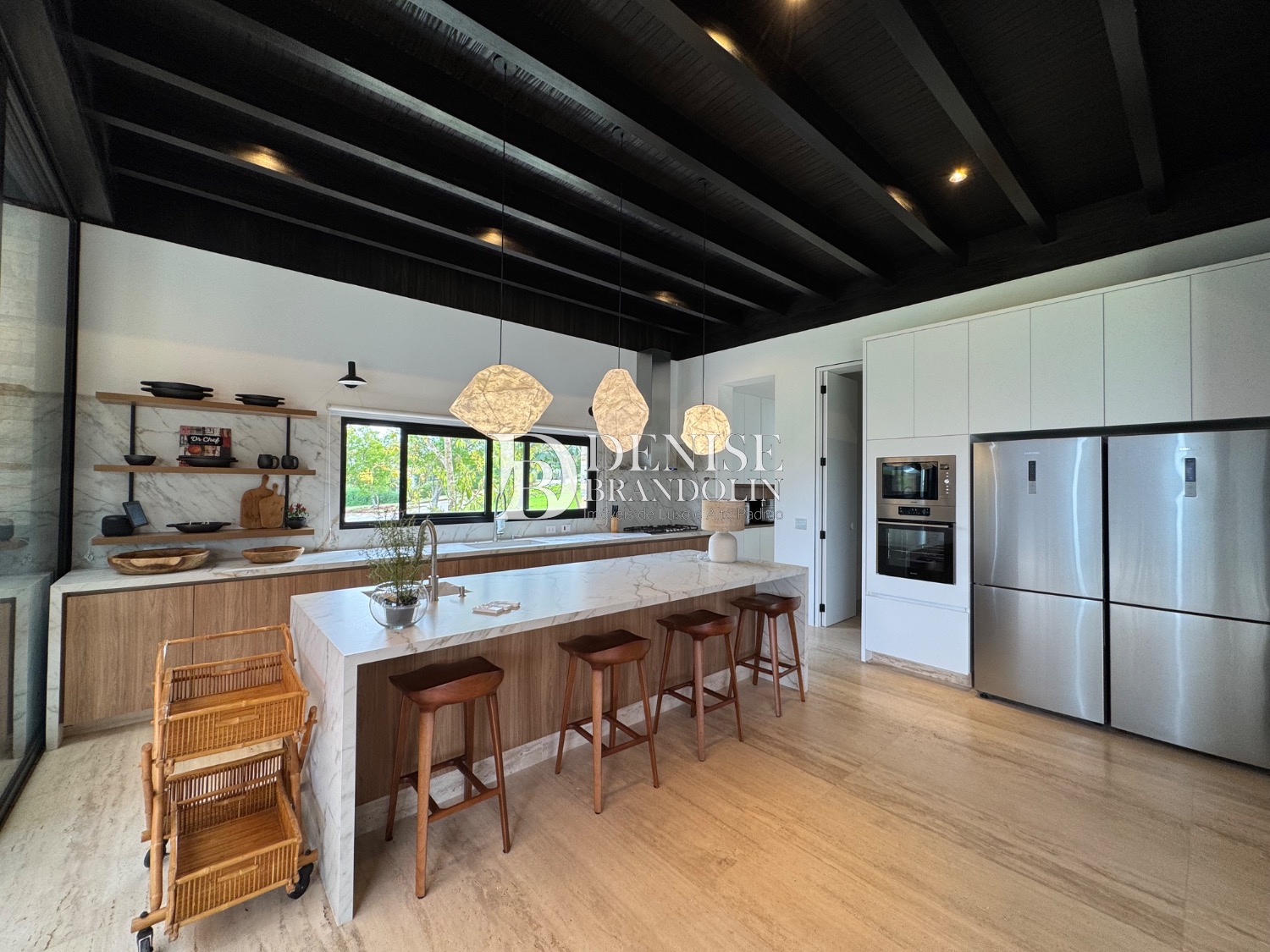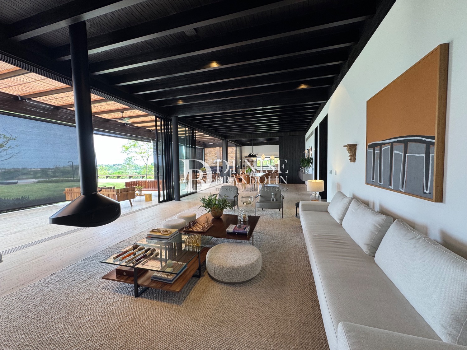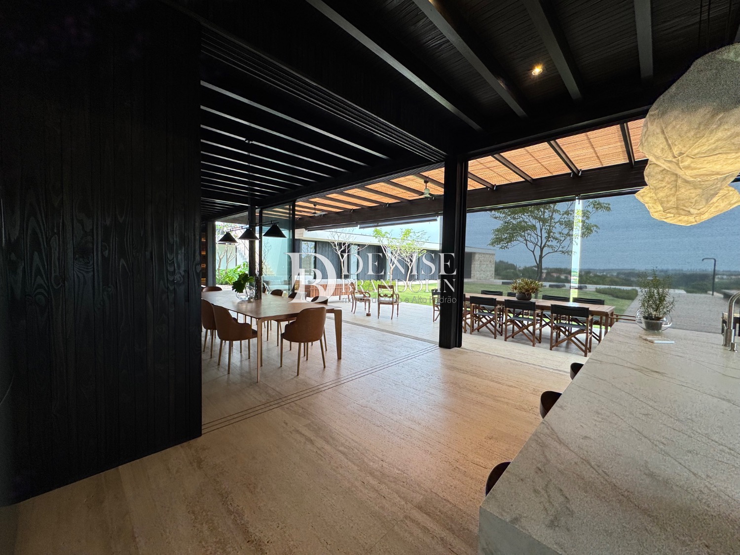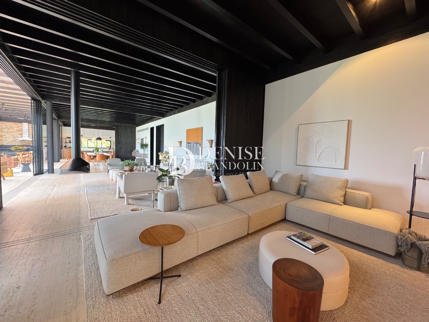 Living para vários ambientes, piso da casa toda em mármore travertino romano, acabamento da fachada em sugi ban (madeira carbonizada quem tem muita durabilidade) técnica japonesa onde as casas são centenárias e o acabamento permanece igual ao longo do tempo.